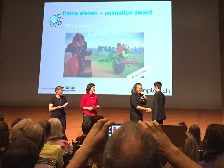 Am letzten Samstag war es dann soweit: Einerseits hat Marc den frame eleven Preis überreichen dürfen. Gewonnen hat Tim Winkelmann. Er wird exklusiv einen Tag bei uns vorbeischauen. Wir hoffen, unsere Profis können all seine Fragen zur Videoproduktion und Animation beantworten, damit er auch in Zukunft weiterhin herrliche Filme realisieren kann. Wie diesen hier.