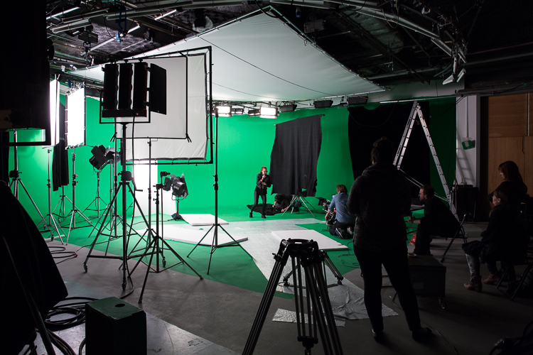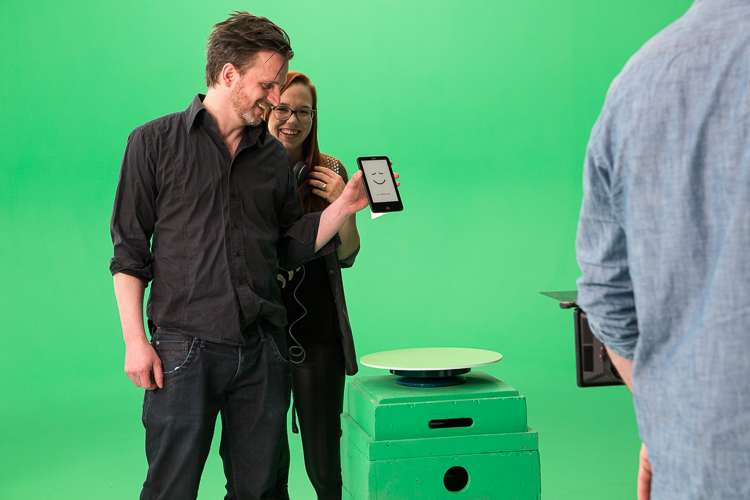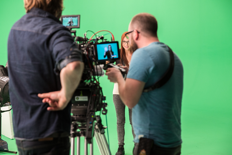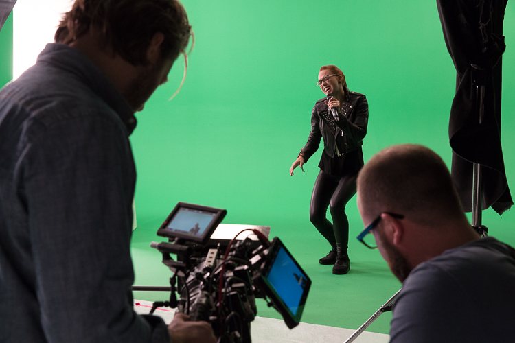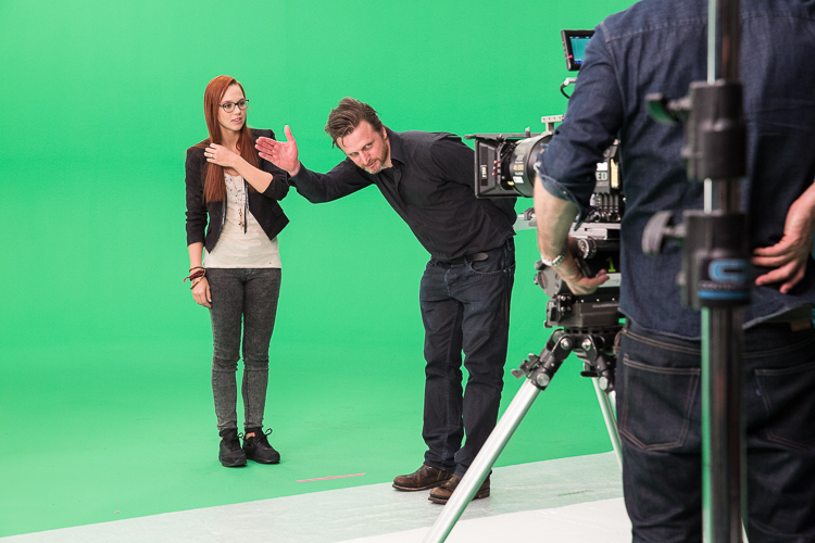 Gedreht wurde alles im Studio auf dem so genannten Greenscreen. Das heisst, Stefanie steht vor grünen Flächen, sodass wir sie in der Postproduction gut vom Hintergrund trennen und auf unseren grafischen, roten Background setzen können.