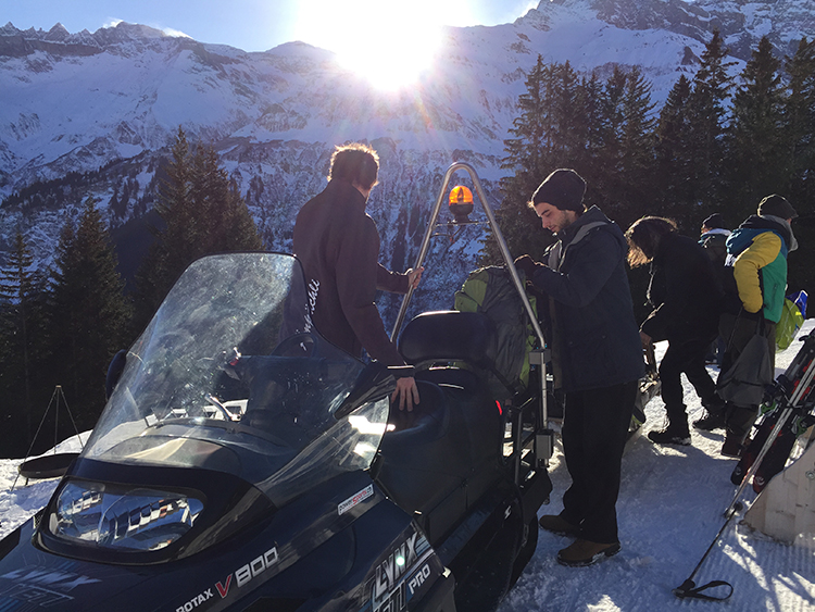 So waren wir früh morgens – ok, nicht ganz so früh, da ein Teil unserer Schauspieler in den falschen Zug eingestiegen war. Ja, auch das kann bei einer Filmproduktion durchaus passieren! 🙂 – auf dem Berg angekommen, da wurde schnell klar, dass wir mobil sein brauchen, um an die sonnigsten Stellen zu gelangen. Ja genau, nur wenig Equipment…! Ohne zu zögern, stand schon ein Schneetöff bereit. Wir konnten loslegen! Bei allen Jungs auf dem Set war jetzt der Smile noch grösser. 🙂